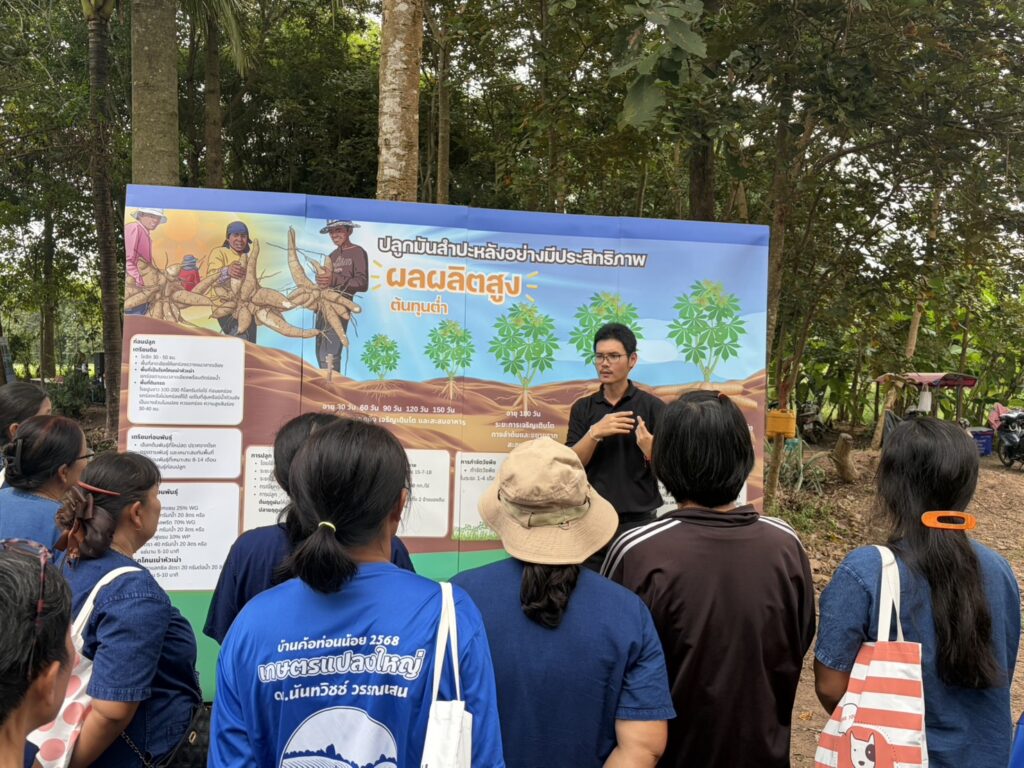 วันอังคารที่ 11 พฤศจิกายน 2568 เวลา 08.30 นายคมกริช ศาลาน้อย เกษตรจังหวัดขอนแก่น มอบหมายให้นางสาวกนิษฐา ชาลีเปลี่ยม นักวิชาการส่งเสริมการเกษตรชำนาญการ กลุ่มส่งเสริมและพัฒนาการผลิต ร่วมเป็นเกียรติในงานวันถ่ายทอดเทคโนโลยีการผลิตท่อนพันธุ์มันสำปะหลังสะอาดและมีคุณภาพ โดยสถาบันวิจัยพืชไร่และพืชทดแทนพลังงาน กรมวิชาการเกษตร การจัดงานครั้งนี้มีวัตถุประสงค์เพื่อถ่ายทอดเทคโนโลยีเทคโนโลยีการผลิตท่อนพันธุ์มันสำปะหลังสะอาดและมีคุณภาพให้แก่เกษตรกรประชาชนทั่วไป และเพื่อสนับสนุนให้เกษตรกรตระหนักถึงความสำคัญของการใช้ท่อนพันธุ์มันสำปะหลังสะอาดและมีคุณภาพ รวมถึงสามารถนำองค์ความรู้ที่ได้รับไปประยุกต์ใช้ในการผลิตของตนเองได้อย่างถูกต้องเหมาะสม มีเกษตรกรเป้าหมายเข้าร่วมจำนวน 100 ราย ณ แปลงเกษตรกร นายวิโรจน์ วงษ์หนองแล้ง บ้านท่อนน้อย ตำบลบ้านค้อ อำเภอเมืองขอนแก่น จังหวัดขอนแก่น