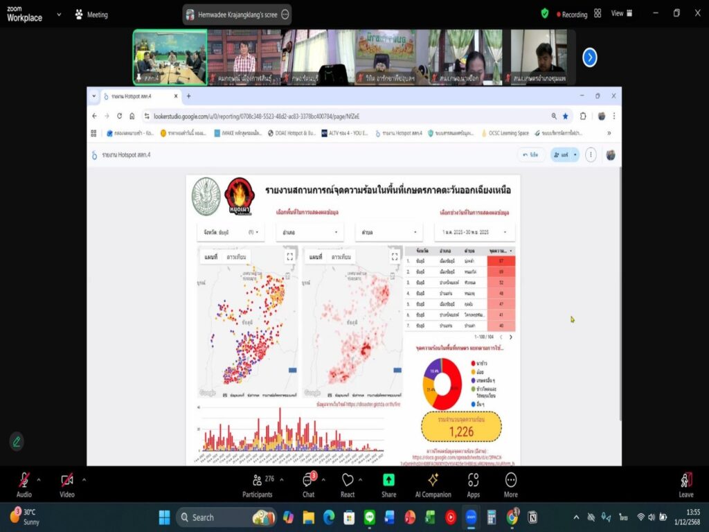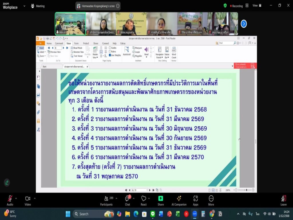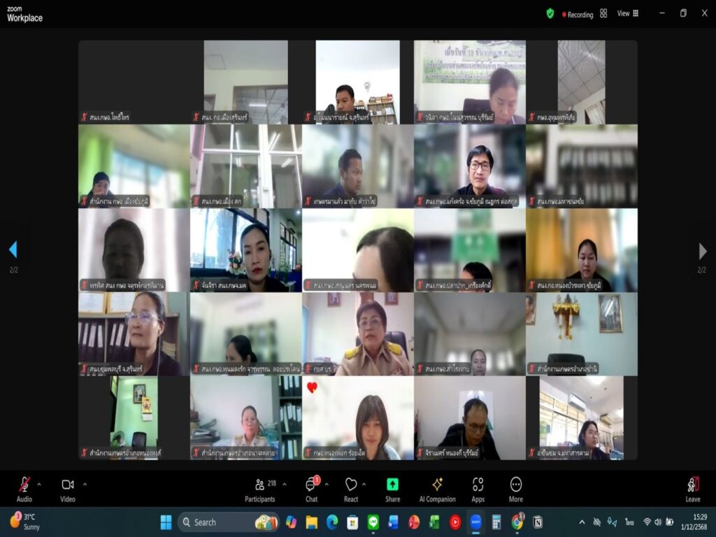 วันจันทร์ที่ 1 ธันวาคม 2568 เวลา 13.30 น. นายคมกริช ศาลาน้อย เกษตรจังหวัดขอนแก่น มอบหมายให้นางสุดารัตน์ ทองเดือน หัวหน้ากลุ่มอารักขาพืช และเจ้าหน้าที่เข้าร่วมประชุมการดำเนินงานตามประกาศกระทรวงเกษตรและสหกรณ์ เรื่องมาตรการบริหารจัดการป้องกันและแก้ไขปัญหาฝุ่นละอองขนาดเล็กไม่เกิน 2.5 ไมครอน (PM 2.5) โดยมีการแจ้งจำนวนเกษตรกรที่มีประวัติการเผาในพื้นที่เกษตรปี 2568 ระหว่างวันที่ 17 มกราคม-31 พฤษภาคม 2568 อีกทั้งยังมีการชี้แจงการรายงานผลการตัดสิทธิ์เกษตรกรที่มีประวัติการเผาในพื้นที่เกษตรจากโครงการสนับสนุนและพัฒนาศักยภาพเกษตรกรทางระบบออนไลน์ ผ่านระบบ application zoom โดยมีนายกมล โสพัฒน์ ผู้อำนวยการสำนักงานส่งเสริมและพัฒนาการเกษตรที่ 4 จังหวัดขอนแก่น เป็นประธานในการประชุม ณ สำนักงานเกษตรจังหวัดขอนแก่น