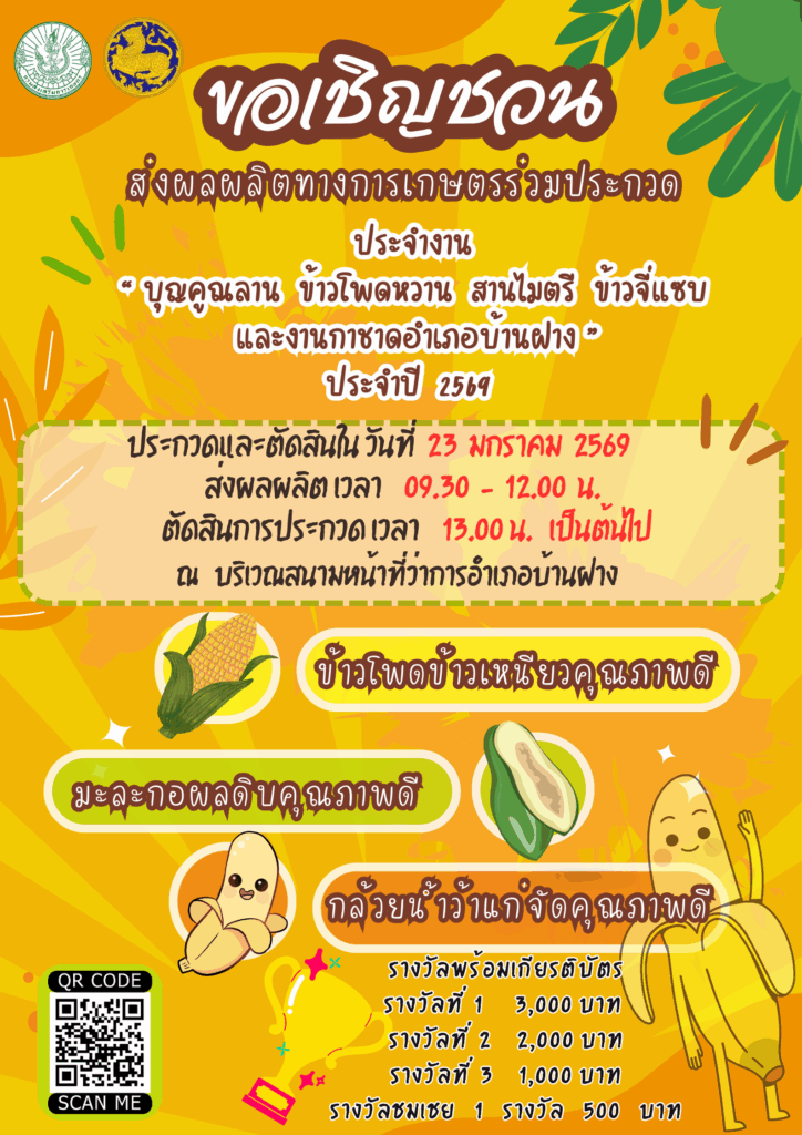 ประชาสัมพันธ์เชิญชวนพี่น้องเกษตรกรชาวอำเภอบ้านฝาง 👉🌽🍌🍌ส่งผลผลิตทางการเกษตร (ข้าวโพดข้าวเหนียว มะละกอดิบ และกล้วยน้ำว้าแก่จัด )ร่วมประกวดในงาน “บุญคูณลาน ข้าวโพดหวาน สานไมตรี ข้าวจี่แซบ และงานกาชาดอำเภอบ้านฝาง“ ปี 2569 👉☎️สอบถามรายละเอียดเพิ่มเติมได้ที่ สนง.เกษตรอำเภอบ้านฝาง 043-269087🙏🏻🙏🏻