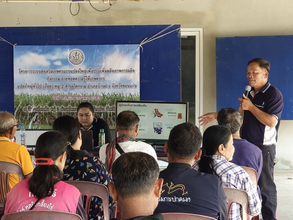 วันที่ 15 มกราคม 2569 นายสมศักดิ์ กันภัย เกษตรอำเภอบ้านฝาง นางดวงจินตน์ เอระน้อย นักวิชาการส่งเสริมการเกษตรชำนาญการ และ นางสาวพรรณทิพา ทองคำเปลวนักวิชาการส่งเสริมการเกษตรชำนาญการ อบรมโครงการระบบส่งเสริม เพิ่มผลิตภาพการผลิต กิจกรรมถ่ายทอดความรู้ ครั้งที่1 ณ แปลงใหญ่ทั่วไป(อ้อย) ม.2 ต.โคกงาม โดยวิทยากรรับเชิญจากบริษัทน้ำตาลขอนแก่น(ksl)นายสายชล เดชงาม หัวหน้าเขตโซน2 และนายกิตติ อ่อนเหลา นักส่งเสริม เขต408