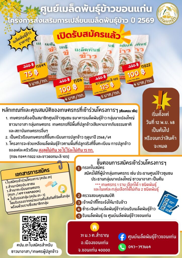 ประชาสัมพันธ์โครงการส่งเสริมการเปลี่ยนเมล็ดพันธุ์ข้าว ปี 2569 รับสมัครตั้งแต่วันที่ 12 พฤศจิกายน 2568 เป็นต้นไปหรือจนกว่าสินค้าจะหมดBy สำนักงานเกษตรอำเภอภูผาม่าน / 12 พฤศจิกายน 2025
