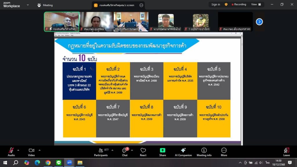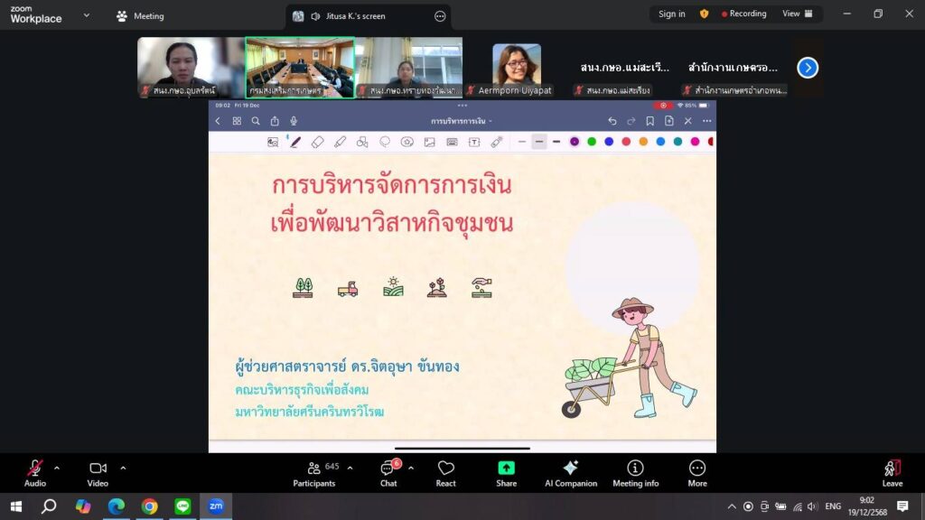 วันที่ 18-19 ธันวาคม 2568 นางรัญดา คำสมหมาย นักวิชาการส่งเสริมการเกษตรชำนาญการ รักษาราชการแทน เกษตรอำเภออุบลรัตน์ มอบหมายให้ นางสาวดวงพร ฐานะ นักวิชาการส่งเสริมการเกษตรชำนาญการ เข้าร่วมอบรมพัฒนาทักษะนายทะเบียนวิสาหกิจชุมชน ผ่านระบบออนไลน์ Zoom Meeting เพื่อสร้างความรู้ ความเข้าใจในการดำเนินงานด้านทะเบียนวิสาหกิจชุมชน เพื่อสามารถให้คำแนะนำและแก้ไขปัญหาในการดำเนินงานด้านทะเบียนวิสาหกิจชุมชนในพื้นที่ได้ รวมถึงพัฒนาส่งเสริมสนับสนุนวิสาหกิจชุมชนให้มีความเข้มแข็ง ระหว่างวันที่ 18 – 19 ธันวาคม 2568 ณ สำนักงานเกษตรอำเภออุบลรัตน์