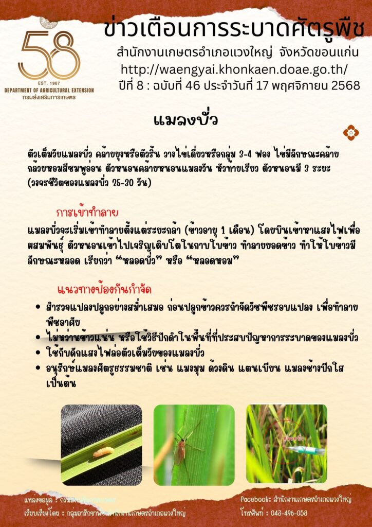 ข่าวเตือนการระบาดแมลงบั่วBy admin_4013 / 22 ธันวาคม 2025 ปีที่ 8 : ฉบับที่ 46 ประจำวันที่ 17 พฤศจิกายน 2568