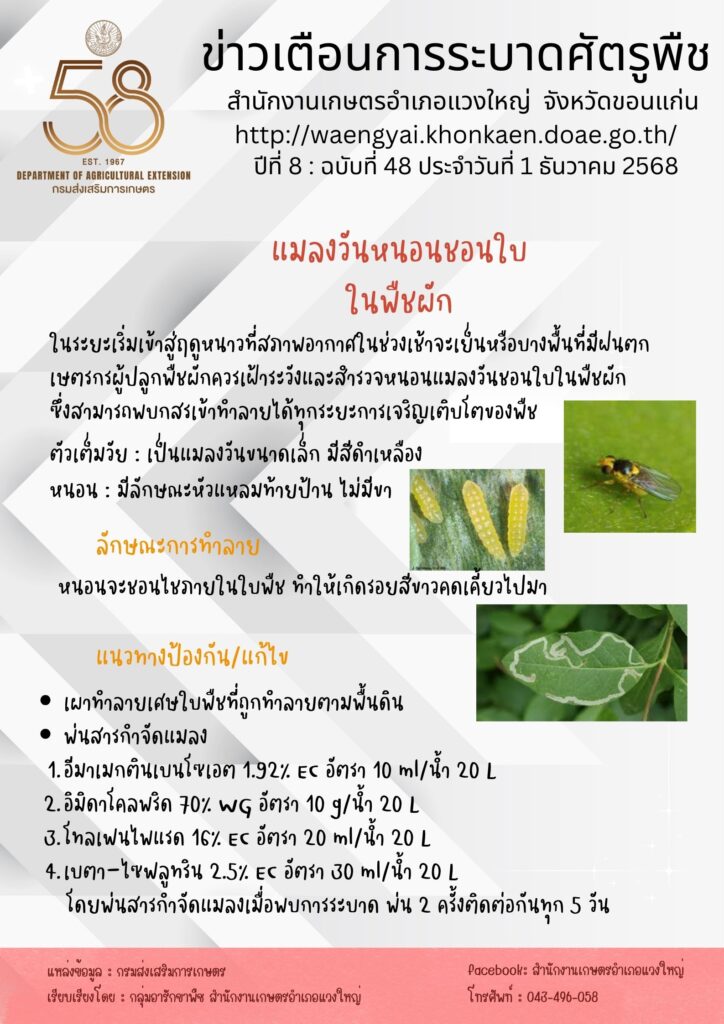 ข่าวเตือนการระบาดแมลงวันหนอนชอนใบในพืชผักBy admin_4013 / 22 ธันวาคม 2025 ปีที่ 8 : ฉบับที่ 48 ประจำวันที่ 1 ธันวาคม 2568
