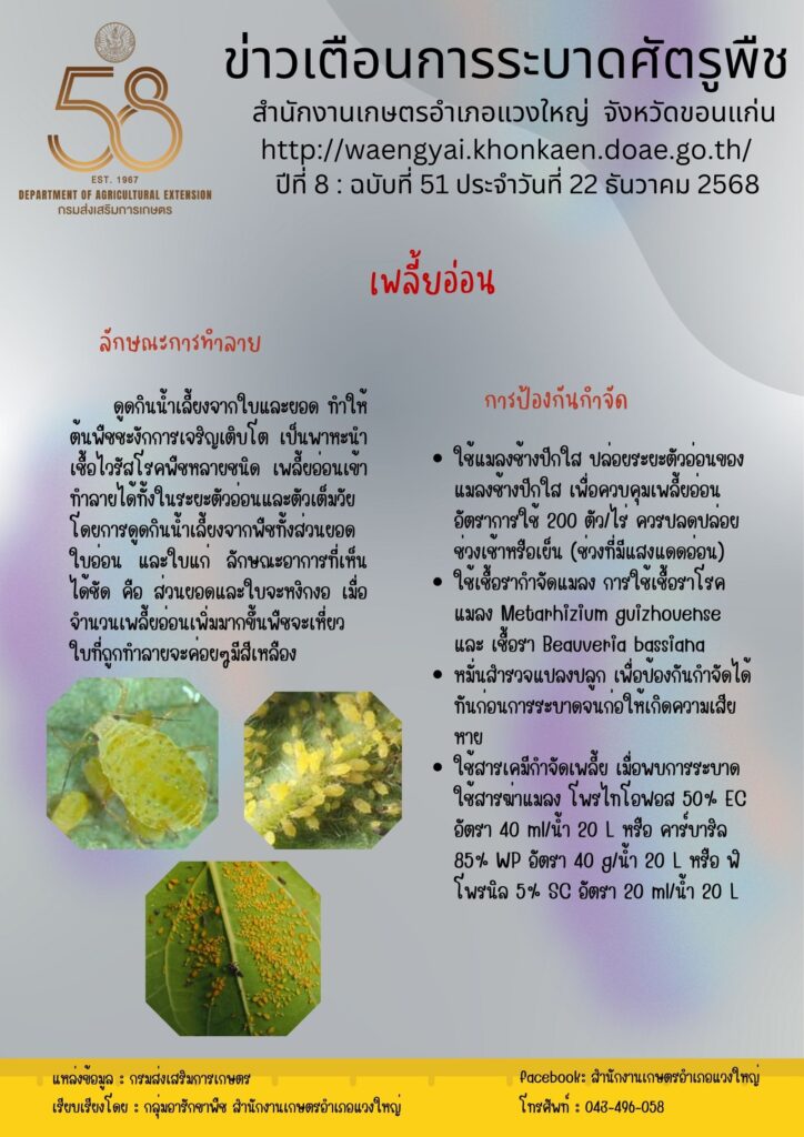 ข่าวเตือนการระบาดเพลี้ยอ่อนBy admin_4013 / 22 ธันวาคม 2025 ปีที่ 8 : ฉบับที่ 51 ประจำวันที่ 22 ธันวาคม 2568