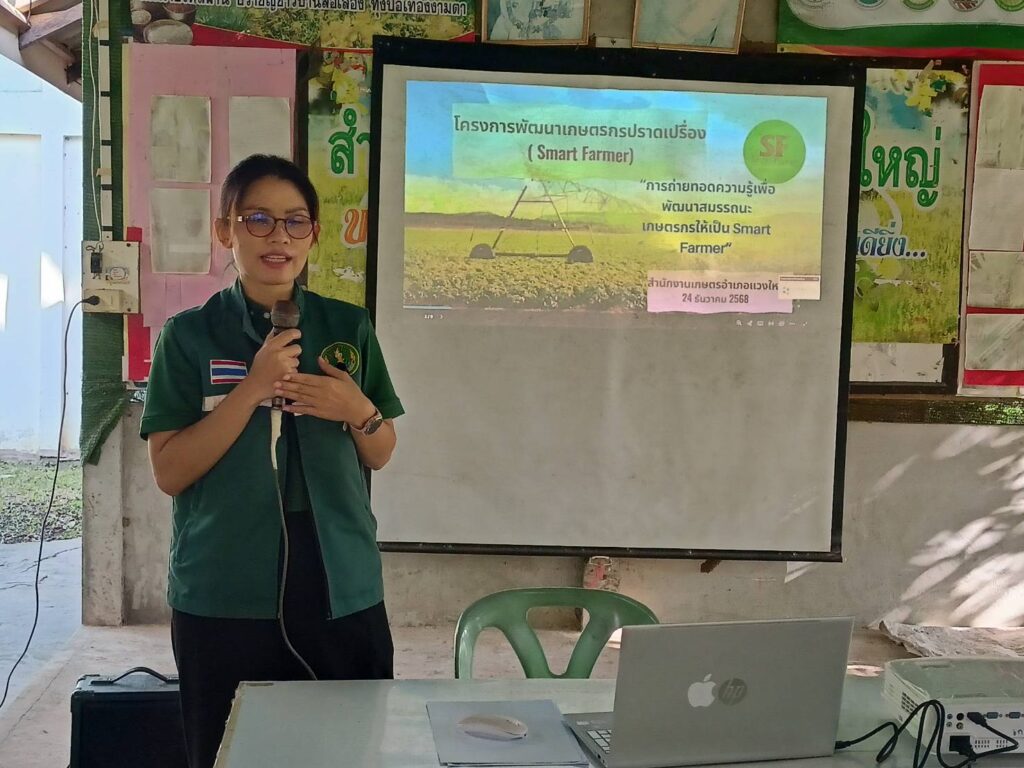 วันที่ 24 ธันวาคม 2568 นางสาวณัฐชานันท์ ผาสุข นักวิชาการส่งเสริมการเกษตรชำนาญการ รักษาราชการแทน เกษตรอำเภอแวงใหญ่ มอบหมาย นางสาวพัชรี ภาโนชิต นักวิชาการส่งเสริมการเกษตรปฏิบัติการ และนางสาวมนัสวี นนท์พรมมา นักวิชาการส่งเสริมการเกษตรปฏิบัติการ จัดอบรมโครงการพัฒนาเกษตรกรปราดเปรื่อง (smart farmer) กิจกรรม ถ่ายทอดความรู้เพื่อพัฒนาสมรรถนะเกษตรกรให้เป็น smart farmer โดยมีวัตถุประสงค์เพื่อ ส่งเสริมและพัฒนาศักยภาพของเกษตรกรให้เป็นเกษตรกรปราดเปรื่อง (Smart farmer) ที่มีศักยภาพในการเพิ่มประสิทธิภาพด้านการผลิต การแปรรูป การตลาดสินค้าเกษตร และการตลาดให้สามารถช่วยเหลือเกื้อกูลกันได้อย่างดี โดยมีเกษตรกรเข้าร่วมโครงการจำนวน 10 ราย ณ สำนักงานเกษตรอำเภอแวงใหญ่
