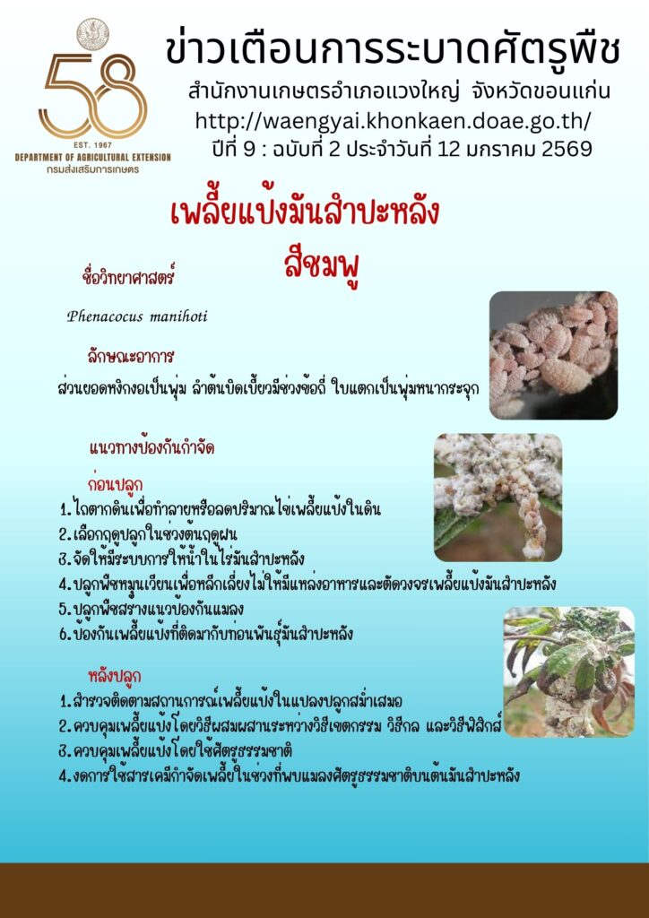 เพลี้ยแป้งมันสำปะหลังสีชมพูBy admin_4013 / 12 มกราคม 2026 ปีที่ 9 : ฉบับที่ 2 ประจำวันที่ 12 มกราคม 2569